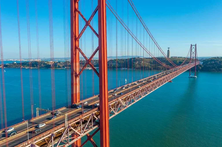 Vi krysser den emblematiske hengebroen over Tejo-elven mot sør. Her ligger regionen Setúbal kjent for sine viner, oster og landbruksproduksjon.